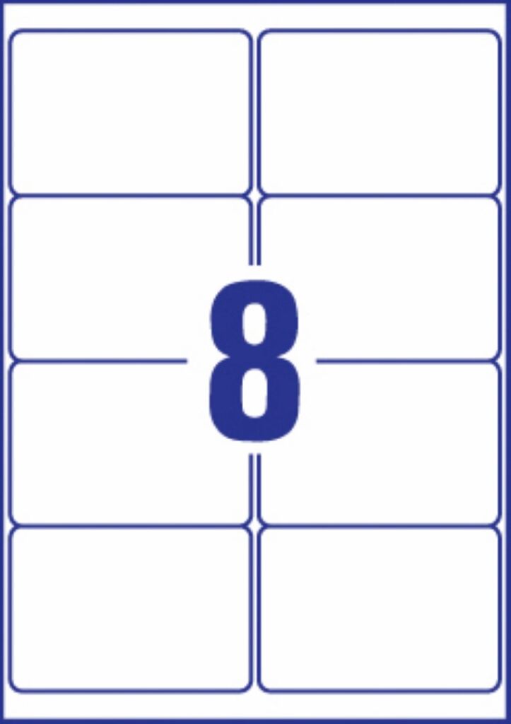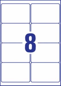 rozměr 99,1×67,7 mm, 100 archů A4, 800 ks v balení (8 ks/arch), papírové, permanentní lepidlo, barva bílá. Typ tiskárny: černobílá laserová, barevná laserová, inkoustová.