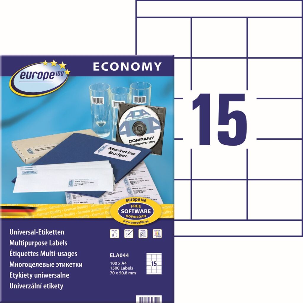 Univerzální samolepící etikety Europe100 ELA044 do kanceláře, obchodu i domácnosti. Ideální na popis výrobků, označování zboží, jako adresní etikety, samolepky na zásilky, přepravní štítky atd. Print etikety Europe100 – vysoká lepivost, bezproblémový průjezd archů tiskárnou a ostré tiskové výsledky bez rozmazávání. Samozřejmostí je čtyřstranný bezpečnostní okraj QCT (Quattro Clean Technology), který zabraňuje vytékání a usazování lepidla v tiskárně. Profesionální kvalita za přesvědčivou cenu! Samolepící štítky Europe100 ELA044 jsou vhodné pro všechny běžné laserové i inkoustové tiskárny, kopírovací stroje a hodí se i pro psaní resp. ruční popis.