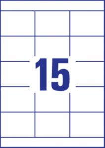 rozměr 70×50,8 mm, 100 archů A4, 1.500 ks etiket v balení (15 ks/arch), papírové, permanentní lepidlo, barva bílá. Typ tiskárny: černobílá laserová, barevná laserová, inkoustová.