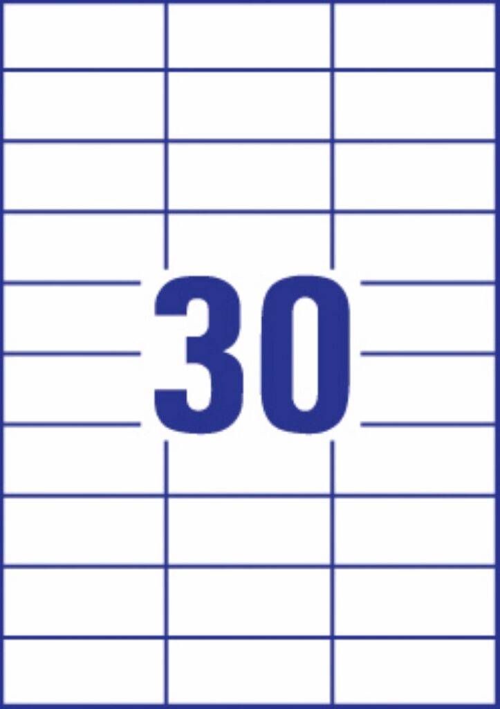 rozměr 70×29,7 mm, 100 archů A4, 3.000 ks etiket v balení (30 ks/arch), papírové, permanentní lepidlo, barva bílá. Typ tiskárny: černobílá laserová, barevná laserová, inkoustová.