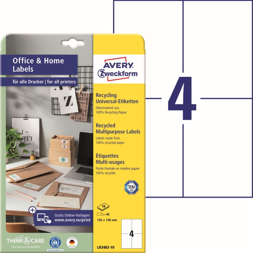 Recyklované samolepící etikety Avery Zweckform LR3483-10 do kanceláře, obchodu i domácnosti, pro všestranné, spolehlivé a ekologické použití. Používejte produkty šetrné k životnímu prostředí! Vysoká a stálá lepivost na běžných površích jako papír, karton, sklo a plast. Při tisku se můžete spolehnout na plynulý průjezd archů tiskárnou bez uvíznutí a ostrý tiskový výstup, který se díky vynikajícímu přilnutí tonerového prášku či inkoustu nerozmazává. Samozřejmostí je čtyřstranný bezpečnostní okraj QCT (Quattro Clean Technology), který zabraňuje vytékání a usazování lepidla v tiskárně. Bezproblémový chod laserových tiskáren je testován a potvrzen certifikátem společnosti TÜV SÜD. Recyklované samolepící štítky Avery LR3483-10 jsou vhodné pro všechny běžné laserové i inkoustové tiskárny, kopírovací stroje a hodí se i pro psaní, resp. ruční popis.