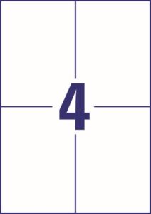 rozměr 105×148 mm, 100 archů A4, 400 ks etiket v balení (4 ks/arch), papírové, permanentní lepidlo, barva přírodní bílá. Typ tiskárny: černobílá laserová, barevná laserová, inkoustová.