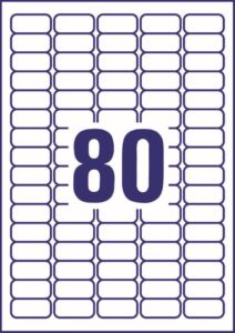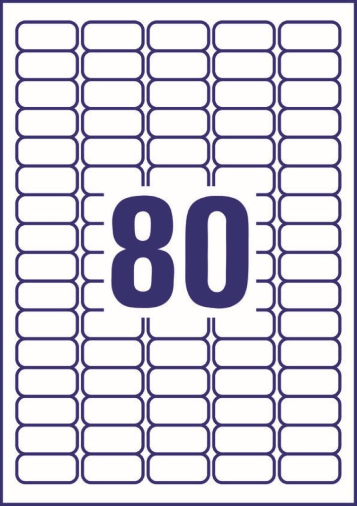 rozměr 35,6×16,9 mm, 10 archů A4, 800 ks etiket v balení (80 ks/arch), papírové, snímatelné lepidlo, barva bílá. Typ tiskárny: černobílá laserová, barevná laserová, inkoustová.