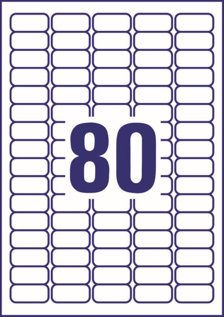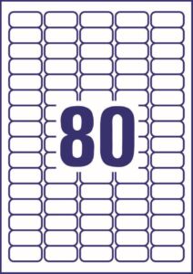 rozměr 35,6×16,9 mm, 100 archů A4, 8.000 ks etiket v balení (80 ks/arch), papírové, snímatelné lepidlo, barva bílá. Typ tiskárny: černobílá laserová, barevná laserová, inkoustová.