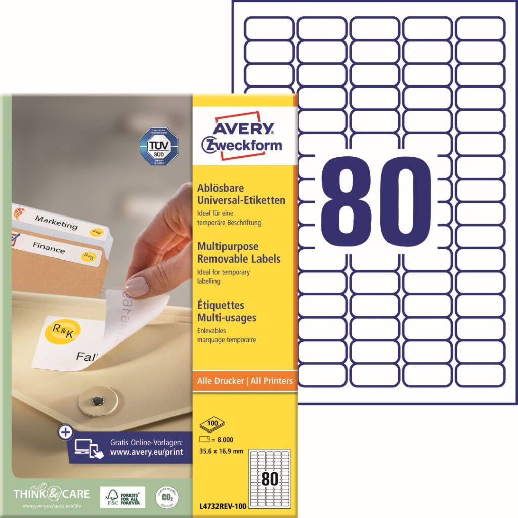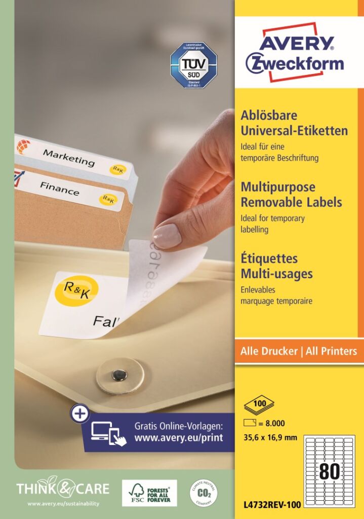 Odnímatelné etikety Avery Zweckform L4732REV-100 do kanceláře, obchodu i domácnosti, ideální na veškeré dočasné nebo měnící se značení. Etikety se snímatelným lepidlem spolehlivě a bezpečně drží, a naopak je můžete snadno odlepit, bez zanechání žádných stop zbytkového lepidla. Ukázka viz Videa (záložka výše). Při tisku se můžete spolehnout na plynulý průjezd archů tiskárnou bez uvíznutí a ostrý tiskový výstup, který se díky vynikajícímu ukotvení tonerového prášku nebo inkoustu nerozmazává. Samozřejmostí je čtyřstranný bezpečnostní okraj QCT (Quattro Clean Technology), který zabraňuje vytékání a usazování lepidla v tiskárně. Bezproblémový provoz laserových tiskáren testován a potvrzen certifikátem TÜV SÜD. Snímatelné etikety Avery Zweckform L4732REV-100 jsou vhodné pro všechny běžné laserové i inkoustové tiskárny, kopírovací stroje a hodí se i pro psaní, resp. ruční popis.