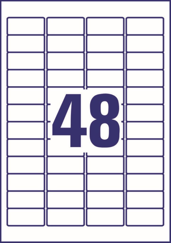 rozměr 45,7×21,2 mm, 30 archů A4, 1.440 ks etiket v balení (48 ks/arch), papírové, snímatelné lepidlo, barva bílá. Typ tiskárny: černobílá laserová, barevná laserová, inkoustová.