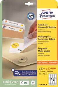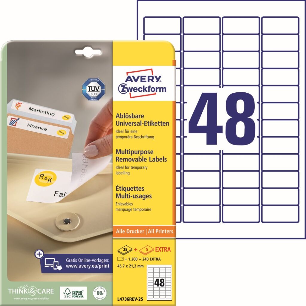 Odnímatelné etikety Avery Zweckform L4736REV-25 do kanceláře, obchodu i domácnosti, ideální na veškeré dočasné nebo měnící se značení. Etikety se snímatelným lepidlem spolehlivě a bezpečně drží, a naopak je lze snadno odlepit, bez zanechání žádných stop zbytkového lepidla. Ukázka viz Videa (záložka výše). Při tisku se můžete spolehnout na plynulý průjezd archů tiskárnou bez uvíznutí a ostrý tiskový výstup, který se díky vynikajícímu ukotvení tonerového prášku nebo inkoustu nerozmazává. Samozřejmostí je čtyřstranný bezpečnostní okraj QCT (Quattro Clean Technology), který zabraňuje vytékání a usazování lepidla v tiskárně. Bezproblémový provoz laserových tiskáren testován a potvrzen certifikátem TÜV SÜD. Snímatelné etikety Avery Zweckform L4736REV-25 jsou vhodné pro všechny běžné laserové i inkoustové tiskárny, kopírovací stroje a hodí se i pro psaní, resp. ruční popis.