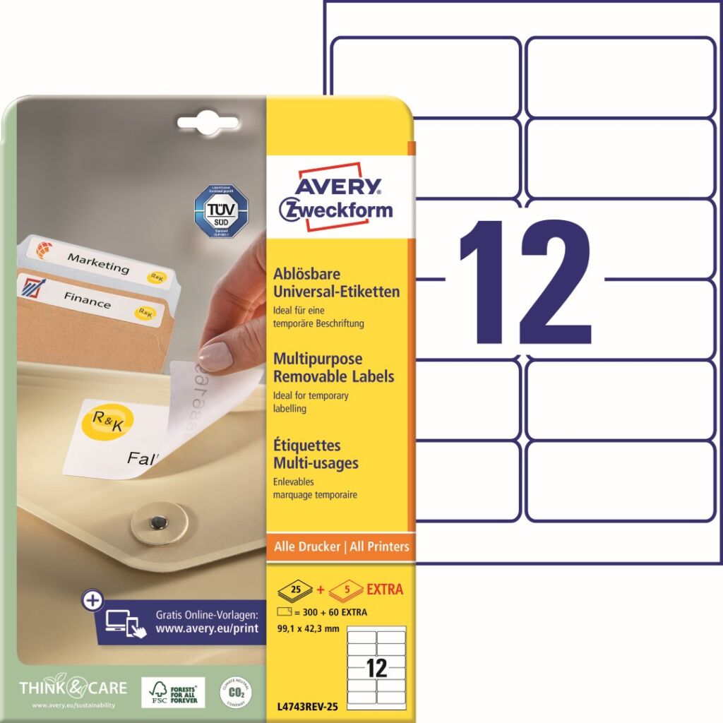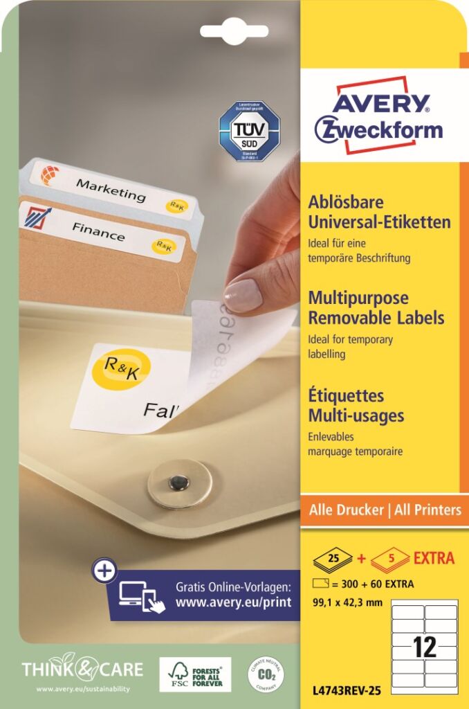 Odnímatelné etikety Avery Zweckform L4743REV-25 do kanceláře, obchodu i domácnosti, ideální na veškeré dočasné nebo měnící se značení. Etikety se snímatelným lepidlem spolehlivě a bezpečně drží, a naopak je lze snadno odlepit, bez zanechání žádných stop zbytkového lepidla. Ukázka viz Videa (záložka výše). Při tisku se můžete spolehnout na plynulý průjezd archů tiskárnou bez uvíznutí a ostrý tiskový výstup, který se díky vynikajícímu ukotvení tonerového prášku nebo inkoustu nerozmazává. Samozřejmostí je čtyřstranný bezpečnostní okraj QCT (Quattro Clean Technology), který zabraňuje vytékání a usazování lepidla v tiskárně. Bezproblémový provoz laserových tiskáren testován a potvrzen certifikátem TÜV SÜD. Snímatelné etikety Avery Zweckform L4743REV-25 jsou vhodné pro všechny běžné laserové i inkoustové tiskárny, kopírovací stroje a hodí se i pro psaní, resp. ruční popis.