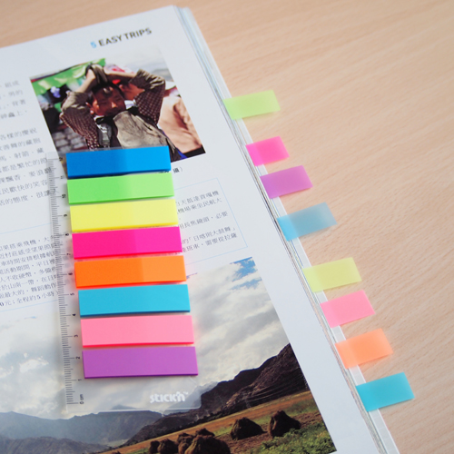 rozměr 45x12 mm, 8 bločků v balení, 25 záložek v každém bločku (celkem 200 záložek), transparentní fólie, snímatelné lepidlo, mix neonových barev.