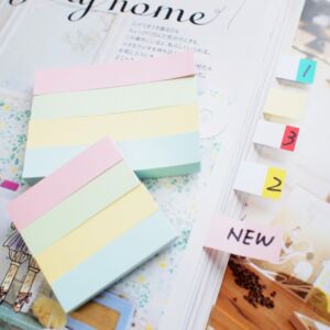 rozměr 50×12 mm, 4 bločky v balení, 100 lístků v každém bločku (celkem 400 lístků), papírové, snímatelné lepidlo, 4 pastelové barvy.