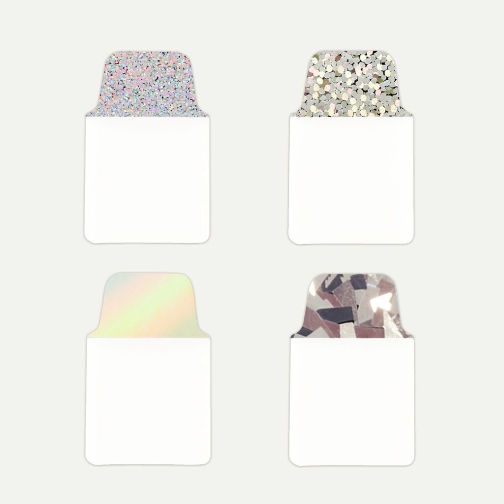 rozměr 25,4×38,1 mm, 32 ks v balení, čirá PET fólie, snímatelné lepidlo, barva stříbrná s holografickými vzory.
