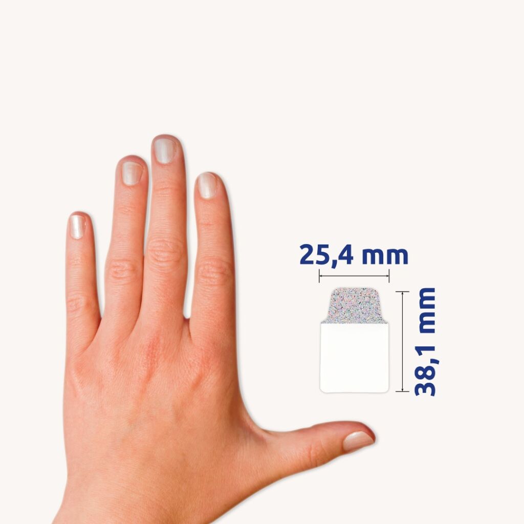 rozměr 25,4x38,1 mm, 32 ks v balení, popisovatelná čirá PET fólie, snímatelné lepidlo, barva stříbrná s holografickými vzory.
