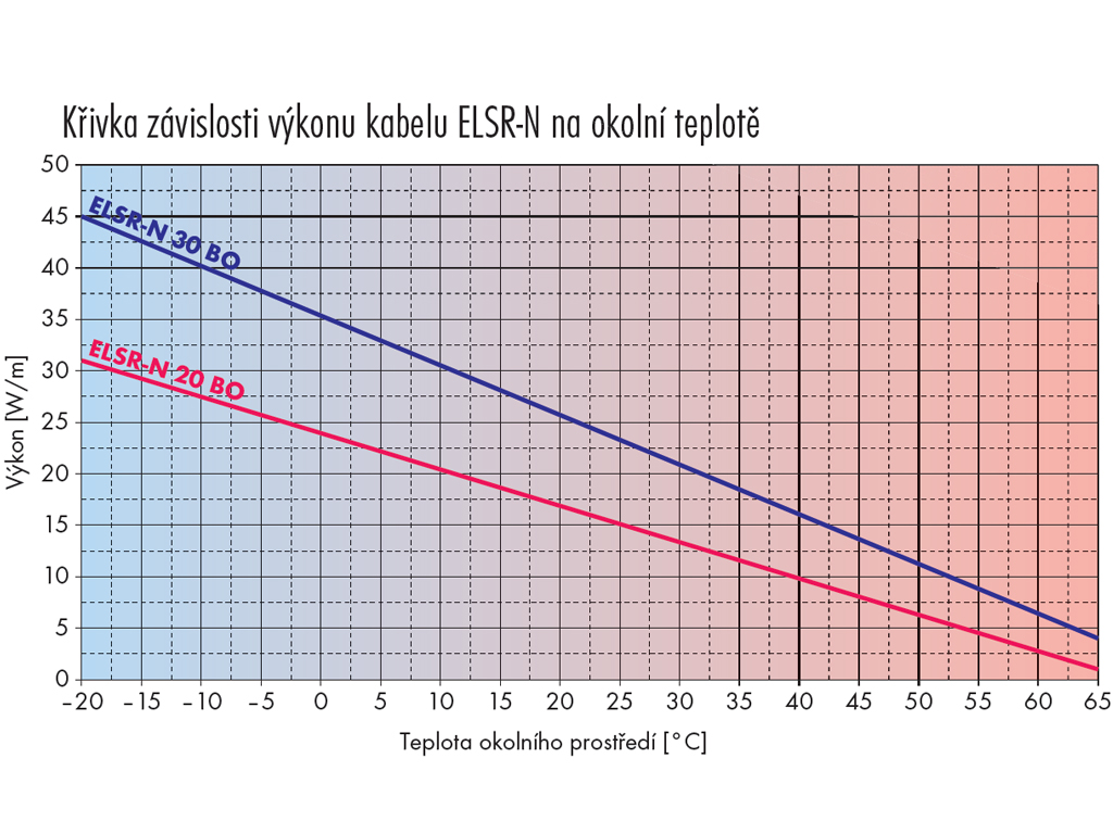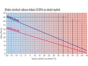 S klesající okolní teplotou výkon samoregulačních topných kabelů automaticky roste, viz. křivka závislosti výkonu kabelu na okolní teplotě.