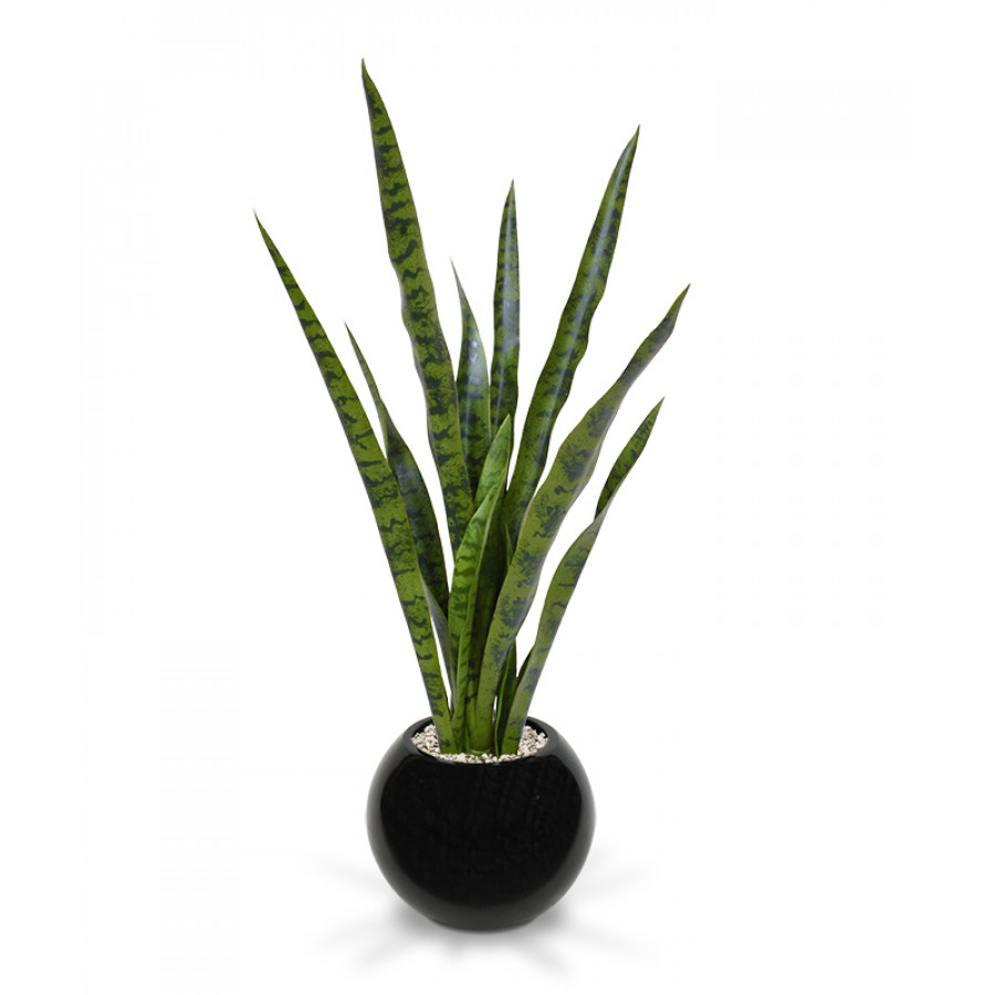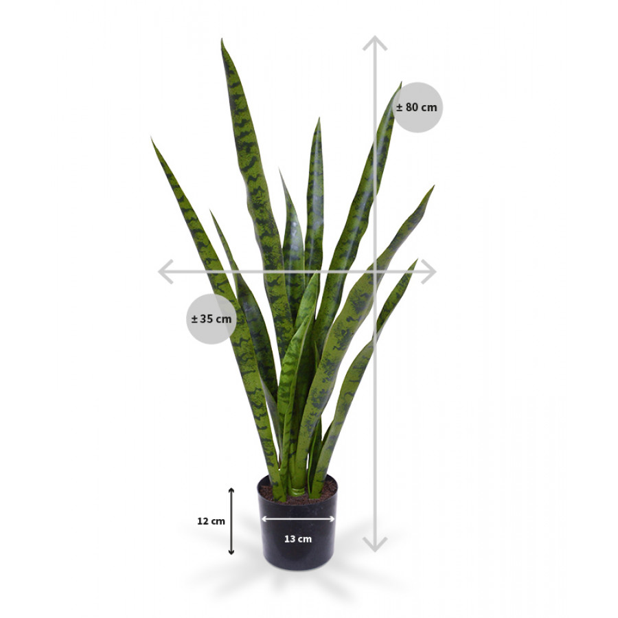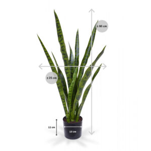 Moderní imitace sanseverie v zeleném provedení. Dodáváno v plastovém květináči 13x12cm. Výška ca 78cm, průměr 35cm.