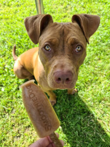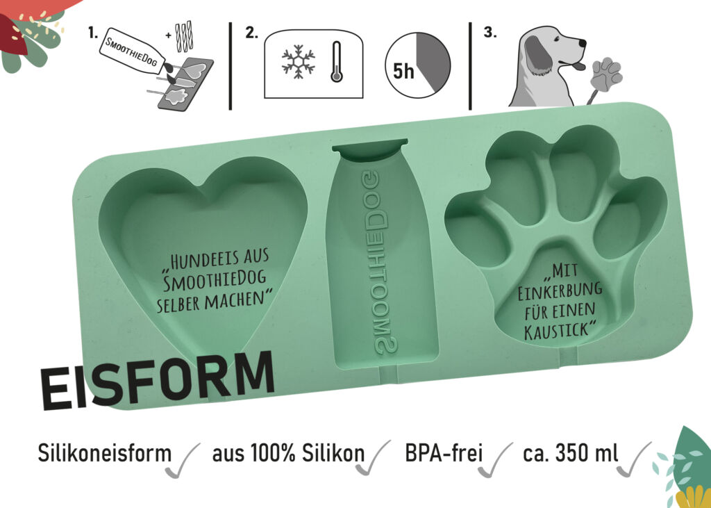 Obsah lahvičky smoothie a 2 vejce smíchejte s 250-400g bramborové mouky. Vložte do silikonových pečících formiček (např. tvar kostička, tlapička….) na 180 stupňů po 20min. Hotovo!