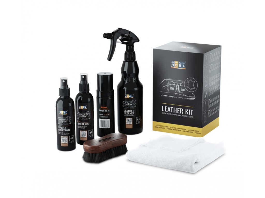Set na kůži ADBL Leather Kit Kompletní set přípravků a příslušenství pro čištění kožených povrchů a následnou ochranu. V setu (oproti konkurenčním setům) můžete najít i osvěžovač vzduchu. S touto sadou hravě vyčistíte a ochráníte několik sedaček v interiéru auta. Set ADBL Leather Kit obsahuje Čistič kůže ADBL Leather Cleaner (500 ml). Impregnaci na kůži ADBL Leather Conditioner (200 ml). Kartáček na kůži ADBL Leather Brush. Malý pěnovač ADBL Foamer. Mikrovláknovou utěrku ADBL Lea. Vůni ADBL Leather Mist (200 ml). Rozprašovač Canyon.