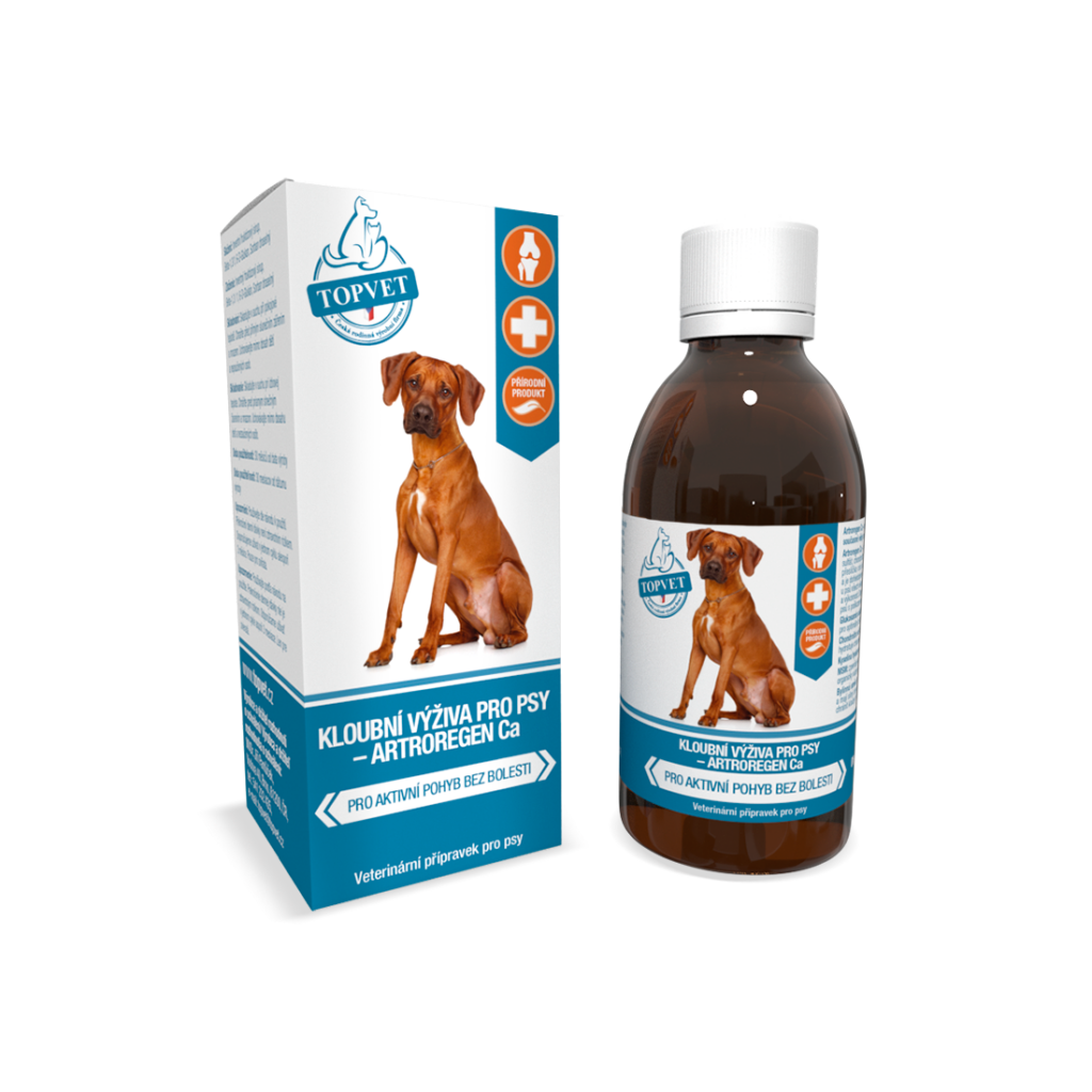 Artroregen Ca – originální receptura spojuje chondroprotektivní stavební látky (glukosamin sulfát, chondroitin sulfát) a unikátní bylinný komplex (šišák bajkalský, bršlice kozí noha, přeslička rolní nať, rdesno nať). O výše uvedených surovinách je historicky známo a je dohledatelné v literatuře, že jsou vhodné k preventivnímu a regeneračnímu použití u psů všech věkových kategorií. Zmírňuje bolest poškozených kloubů a zlepšuje hybnost a výkonnost. Doporučujeme užívat preventivně od 3 měsíců věku a jako podporu terapie psů s poškozenými klouby.