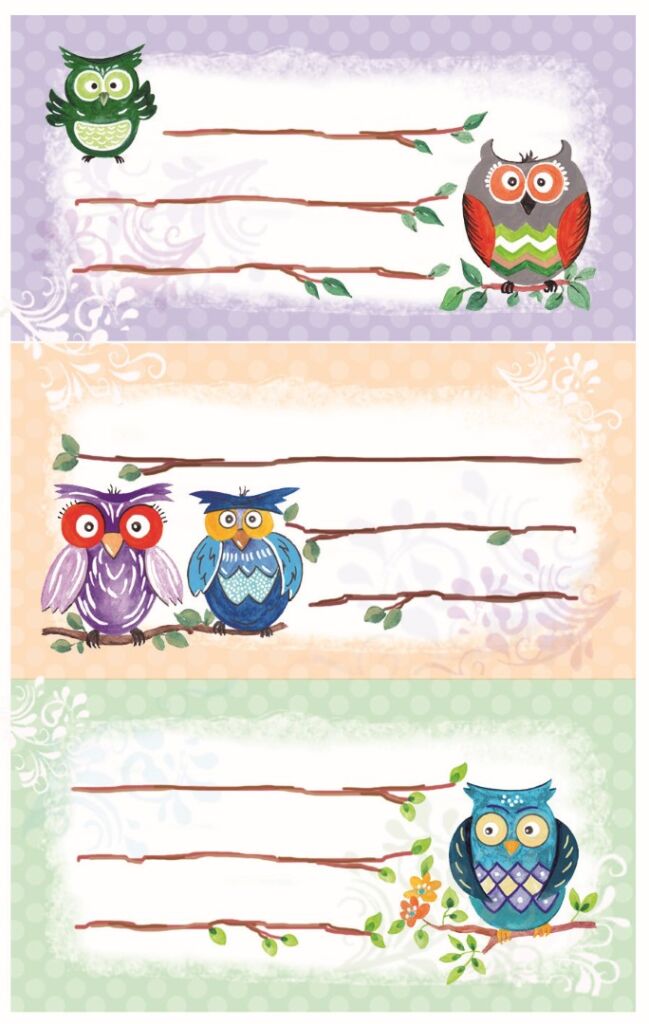 Rozměr 70x36 mm, 6 ks etiket v balení, papírové, permanentní lepidlo, motiv sovy. Samolepící štítky na sešity, knihy, desky apod.