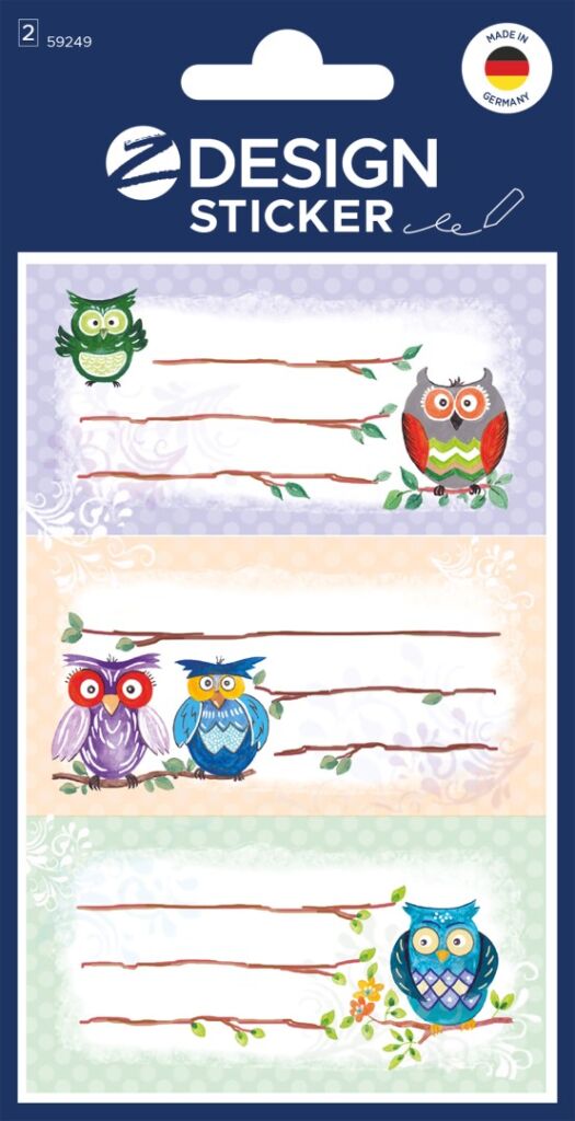 Rozměr 70×36 mm, 6 ks etiket v balení, papírové, permanentní lepidlo, motiv sovy. Balení obsahuje 2 stejné aršíky vyobrazených samolepek.