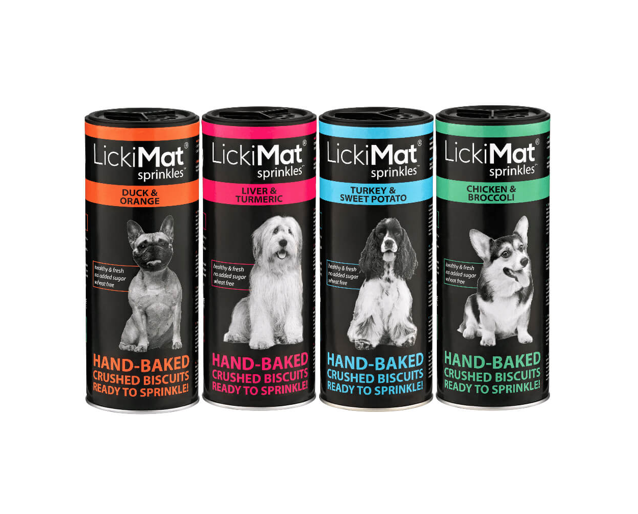LickiMat® Sprinkles™ jsou drcené psí sušenky určené speciálně na podložky LickiMat®! Použijte je jako posyp pro zpestření roztíratelných dobrot nebo podložku namočte a nechte kousky, aby se k ní přilepily a pejska zabavily.