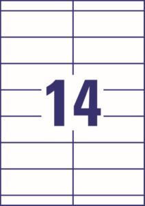 rozměr 105×38 mm, 25 archů A4, 350 ks štítků v balení (14 ks/arch), gramáž papíru 185 g/m2, barva bílá. Typ tiskárny: černobílá laserová, barevná laserová, inkoustová.