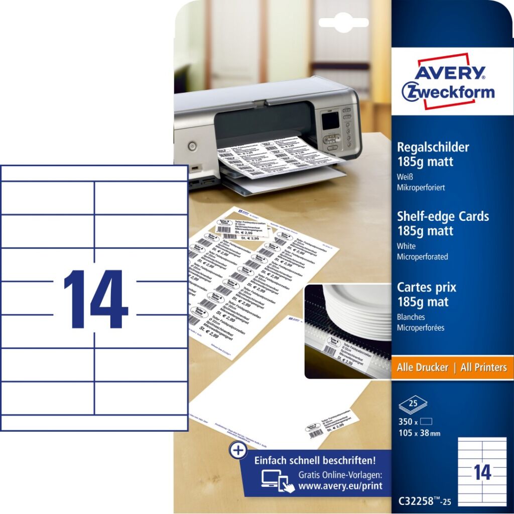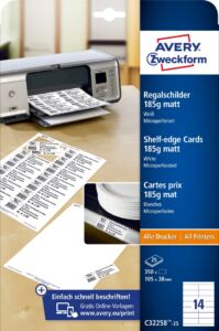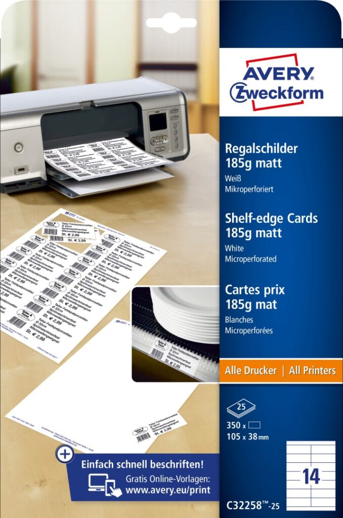 Štítky na prodejní stojany Avery Zweckform C32258-25 jsou vhodné na popis prodejních nebo skladovacích stojanů apod. Optimální formát vhodný pro regálová čela s výškou do 40mm. Praktické, oboustranně potisknutelné štítky s vysokou gramáží pro různé způsoby použití v domácnosti, v obchodě nebo v kanceláři – vytvořte si je proto sami, podle Vašich představ, jednoduše z pohodlí Vašeho domova nebo kanceláře. Hrany karet s velmi jemnou mikroperforací, díky které od sebe jednotlivé karty velice snadno oddělíte. Při tisku se můžete spolehnout na hladký průjezd archů tiskárnou bez uvíznutí a ostrý tiskový výstup, který se díky vynikajícímu ukotvení tonerového prášku nebo inkoustu nerozmazává. Potisknutelné štítky na regály Avery Zweckform C32258-25 jsou vhodné pro všechny běžné laserové i inkoustové tiskárny, kopírovací stroje a hodí se i pro psaní, resp. ruční popis.
