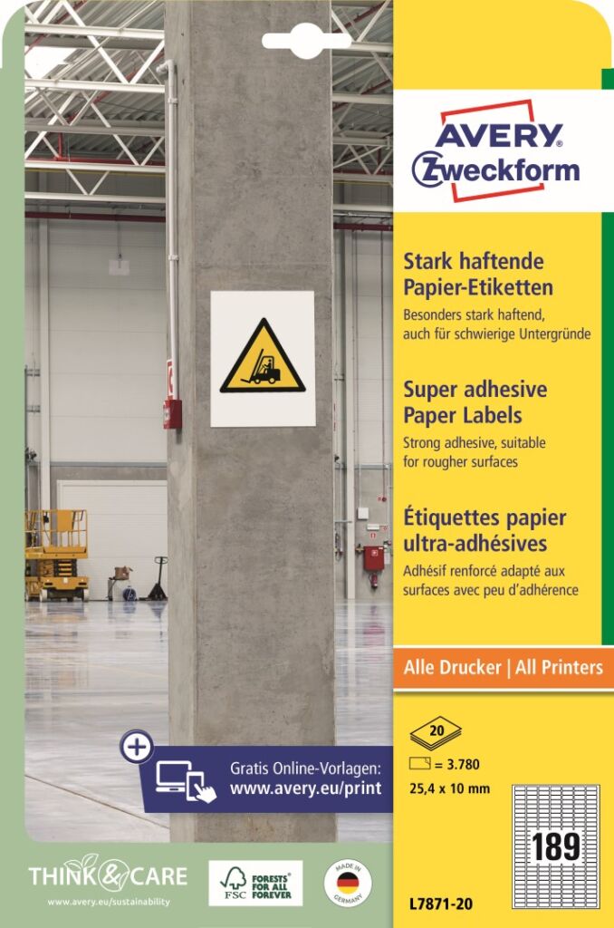 Velmi silně lepivé etikety Avery Zweckform L7871-20 určené do vnitřních prostor, které drží dvakrát silněji než běžné papírové etikety. Spolehlivá přilnavost na vlhké, teplé, studené i nerovnoměrné, drsné nebo prašné povrchy při různých teplotách. Vhodné na interiérové značení v oblasti průmyslu, výroby, skladování atd. Při tisku se můžete spolehnout na plynulý průjezd archů tiskárnou bez uvíznutí, čtyřstranný bezpečnostní okraj QCT (Quattro Clean Technology), který zabraňuje vytékání a usazování lepidla v tiskárně a ostrý tiskový výstup, který se díky vynikajícímu přilnutí tonerového prášku či inkoustu nerozmazává. Super lepivé štítky Avery L7871-20 jsou vhodné pro všechny běžné laserové i inkoustové tiskárny a kopírovací stroje a hodí se i pro psaní, resp. ruční popis.