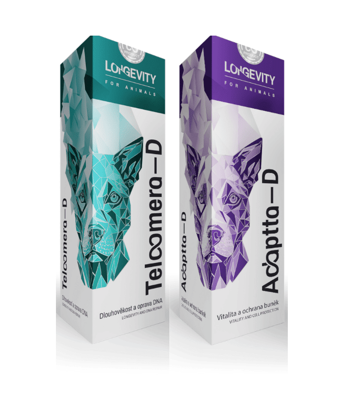 Teloomera-D je veterinární doplněk zaměřený na opravu DNA a prodloužení telomer, což může přispět ke zpomalení procesů stárnutí. Adaptta-D se zaměřuje na zlepšení adaptability psů na fyzický a emocionální stres, posiluje vitalitu, chrání buňky a tkáně před oxidačním stresem a přispívá k posílení imunity. Produkty jsou schválené pro použití a jsou volně prodejné bez veterinárního předpisu. Kombinace obou přípravků může přispět k oddálení degenerativních onemocnění a přispět k prodloužení zdravého života psů.