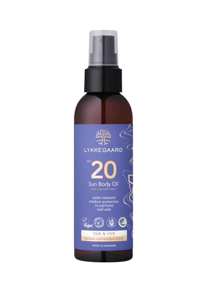 Luxusní tělový olej na opalování LYKKEGAARD Sun Body Oil SPF 20 zvýrazňuje opálení pokožky a dodává pokožce zdravý a přirozeně opálený vzhled. Tělový olej zároveň poskytujevoděodolnou ochranu SPF 20 před škodlivými UVA a UVB paprsky.