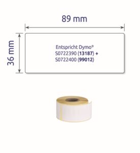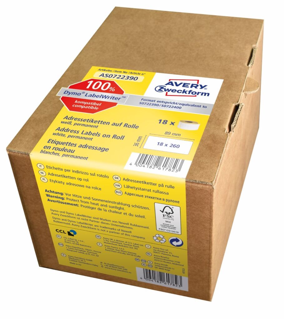 Termoetikety na roli Avery Zweckform AS0722390 jsou kompatibilní náhradou za originální štítky Dymo 13187, Dymo S0722390, Dymo 99012, Dymo S0722400 a štítky Seiko SLP-2RLE.