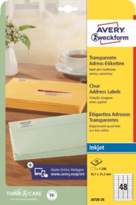 Transparentní Inkjet etikety Avery Zweckform J4720-25 jsou ideální jako prvotřídní adresní nebo označovací etikety. Po přilepení téměř neviditelné. Díky praktické pomůcce QuickPEEL™ můžete jednotlivé etikety odlepovat z archu snadno a rychle. Ukázka viz Videa (záložka výše). Etikety jsou odolné vůči stříkající vodě, mastnotě, znečištění, roztržení a teplotám od -20°C do +80°C. Při tisku se můžete spolehnout na plynulý průjezd archů tiskárnou bez uvíznutí a ostrý tiskový výstup, který se díky vynikajícímu ukotvení inkoustu nerozmazává. Samozřejmostí je čtyřstranný bezpečnostní okraj QCT (Quattro Clean Technology), který zabraňuje vytékání a usazování lepidla v tiskárně. Transparentní samolepící štítky Avery J4720-25 jsou vhodné pro všechny běžné inkoustové tiskárny.