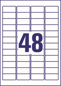 rozměr 45,7×21,2 mm, 25 archů A4, 1.200 ks etiket v balení (48 ks/arch), odolná PET fólie, permanentní lepidlo. Typ tiskárny: inkoustová.