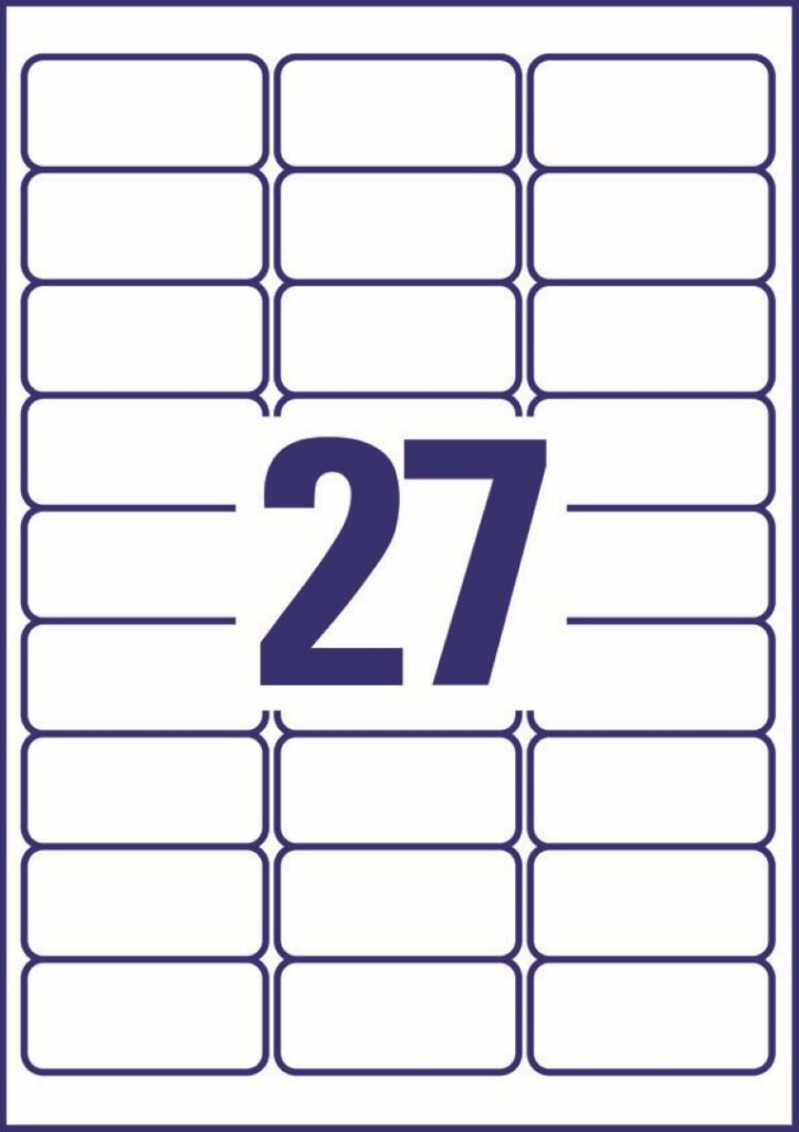 rozměr 63,5×29,6 mm, 25 archů A4, 675 ks etiket v balení (27 ks/arch), odolná PET fólie, permanentní lepidlo. Typ tiskárny: inkoustová.