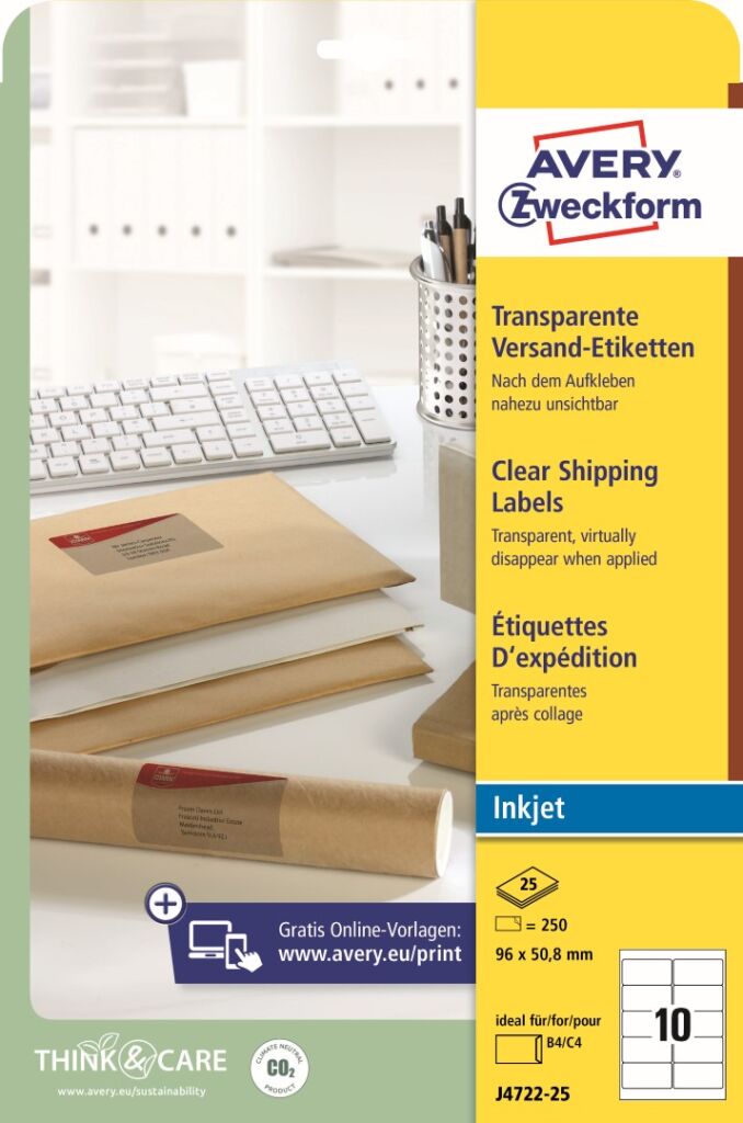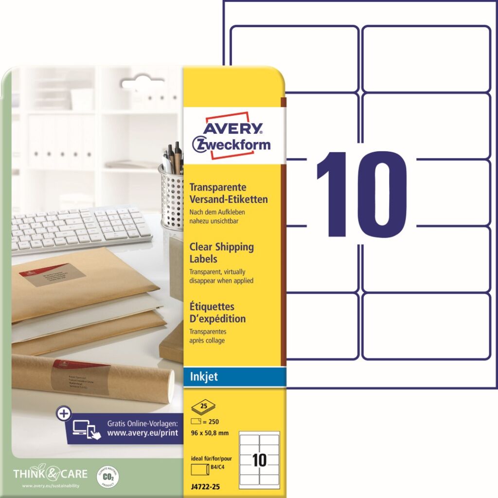 Transparentní Inkjet etikety Avery Zweckform J4722-25 jsou ideální jako prvotřídní adresní nebo označovací etikety. Po přilepení téměř neviditelné. Díky praktické pomůcce QuickPEEL™ můžete jednotlivé etikety odlepovat z archu snadno a rychle. Ukázka viz Videa (záložka výše). Etikety jsou odolné vůči stříkající vodě, mastnotě, znečištění, roztržení a teplotám od -20°C do +80°C. Při tisku se můžete spolehnout na plynulý průjezd archů tiskárnou bez uvíznutí a ostrý tiskový výstup, který se díky vynikajícímu ukotvení inkoustu nerozmazává. Samozřejmostí je čtyřstranný bezpečnostní okraj QCT (Quattro Clean Technology), který zabraňuje vytékání a usazování lepidla v tiskárně. Transparentní samolepící štítky Avery J4722-25 jsou vhodné pro všechny běžné inkoustové tiskárny.