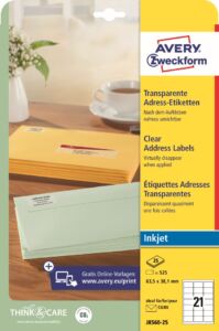 Transparentní Inkjet etikety Avery Zweckform J8560-25 jsou ideální jako prvotřídní adresní nebo označovací etikety. Po přilepení téměř neviditelné. Díky praktické pomůcce QuickPEEL™ můžete jednotlivé etikety odlepovat z archu snadno a rychle. Ukázka viz Videa (záložka výše). Etikety jsou odolné vůči stříkající vodě, mastnotě, znečištění, roztržení a teplotám od -20°C do +80°C. Při tisku se můžete spolehnout na plynulý průjezd archů tiskárnou bez uvíznutí a ostrý tiskový výstup, který se díky vynikajícímu ukotvení inkoustu nerozmazává. Samozřejmostí je čtyřstranný bezpečnostní okraj QCT (Quattro Clean Technology), který zabraňuje vytékání a usazování lepidla v tiskárně. Transparentní samolepící štítky Avery Zweckform J8560-25 jsou vhodné pro všechny běžné inkoustové tiskárny.