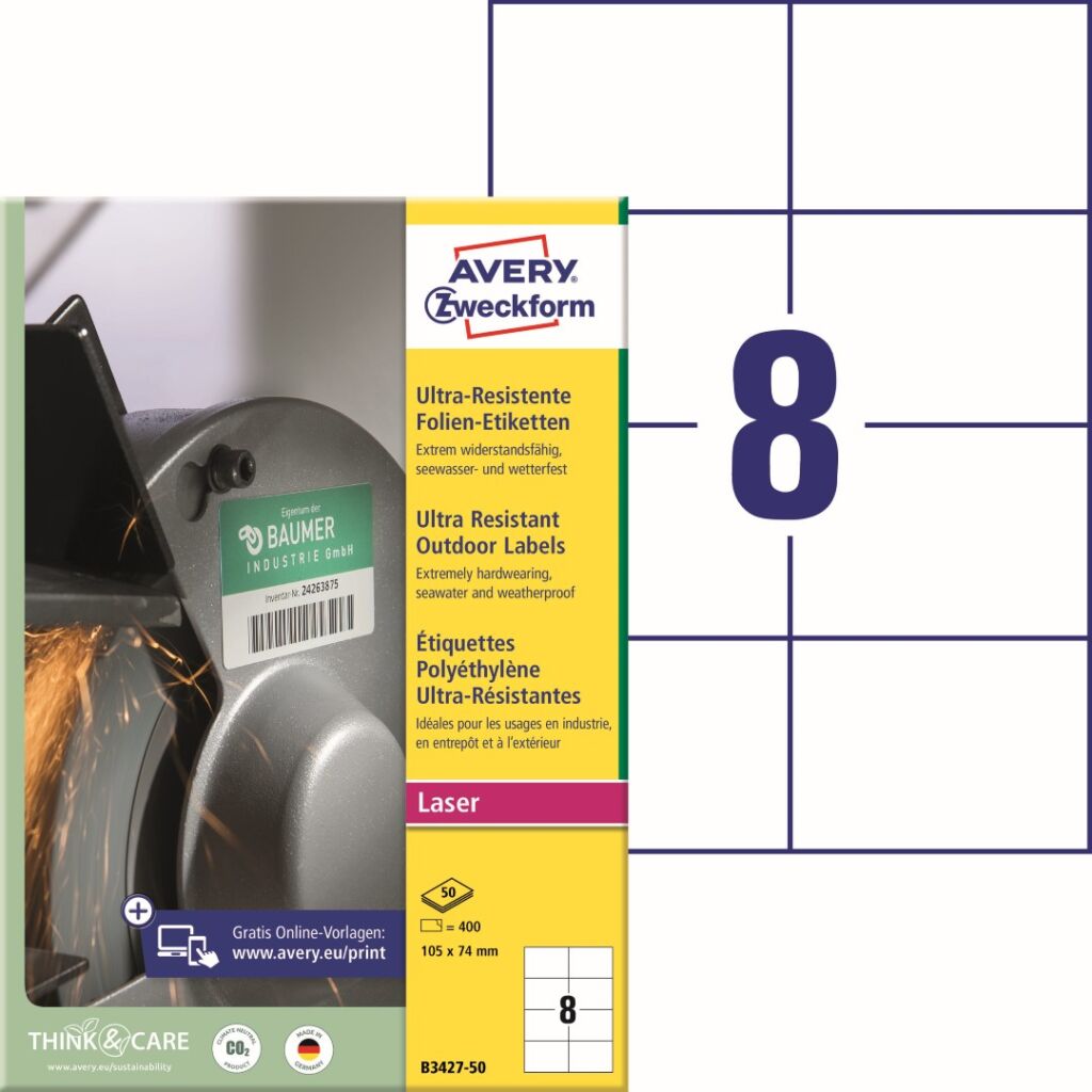 Extrémně odolné etikety Avery Zweckform L3427-50 do těch nejnáročnějších podmínek! Ideální na označování v oblasti výroby a skladování, značení výrobků, majetku, popis kontejnerů apod. Silná a trvalá přilnavost k nejrůznějším povrchům. Etikety jsou vyrobeny z flexibilního polyetylenového materiálu a jsou omyvatelné, odolné vůči mnoha rozpouštědlům a čistícím prostředkům, stříkající vodě i mořské, nečistotám, mastnotě, UV záření, stárnutí a teplotám od -40°C do +150°C. Při tisku se můžete spolehnout na plynulý průjezd archů tiskárnou bez uvíznutí a ostrý tiskový výstup, který se díky vynikajícímu ukotvení tonerového prášku nerozmazává. Samozřejmostí je čtyřstranný bezpečnostní okraj QCT (Quattro Clean Technology), který zabraňuje vytékání a usazování lepidla v tiskárně. Ultra odolné samolepící etikety Avery B3427-50 jsou vhodné pro všechny běžné černobílé a barevné laserové tiskárny a kopírovací stroje.