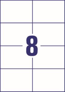 rozměr 105×74 mm, 50 archů A4, 400 ks etiket v balení (8 ks/arch), PE fólie, permanentní lepidlo, barva bílá. Typ tiskárny: černobílá laserová, barevná laserová.