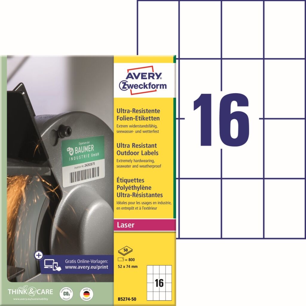 Extrémně odolné etikety Avery Zweckform L5274-50 do těch nejnáročnějších podmínek! Ideální na označování v oblasti výroby a skladování, značení výrobků, majetku, popis kontejnerů apod. Silná a trvalá přilnavost k nejrůznějším povrchům. Etikety jsou vyrobeny z flexibilního polyetylenového materiálu a jsou omyvatelné, odolné vůči mnoha rozpouštědlům a čistícím prostředkům, stříkající vodě i mořské, nečistotám, mastnotě, UV záření, stárnutí a teplotám od -40°C do +150°C. Při tisku se můžete spolehnout na plynulý průjezd archů tiskárnou bez uvíznutí a ostrý tiskový výstup, který se díky vynikajícímu ukotvení tonerového prášku nerozmazává. Samozřejmostí je čtyřstranný bezpečnostní okraj QCT (Quattro Clean Technology), který zabraňuje vytékání a usazování lepidla v tiskárně. Ultra odolné samolepící etikety Avery B5274-50 jsou vhodné pro všechny běžné černobílé a barevné laserové tiskárny a kopírovací stroje.