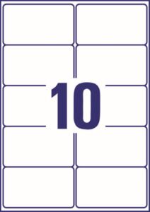 rozměr 99×57 mm, 50 archů A4, 500 ks etiket v balení (10 ks/arch), PE fólie, permanentní lepidlo, barva bílá. Typ tiskárny: černobílá laserová, barevná laserová.