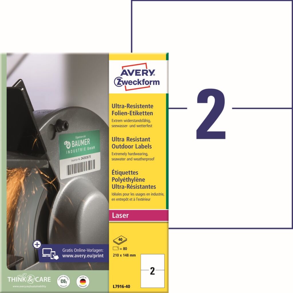 Extrémně odolné etikety Avery Zweckform L7916-40 do těch nejnáročnějších podmínek! Ideální na označování v oblasti výroby a skladování, značení výrobků, majetku, popis kontejnerů apod. Silná a trvalá přilnavost k nejrůznějším povrchům. Etikety jsou vyrobeny z flexibilního polyetylenového materiálu a jsou omyvatelné, odolné vůči mnoha rozpouštědlům a čistícím prostředkům, stříkající vodě i mořské, nečistotám, mastnotě, UV záření, stárnutí a teplotám od -40°C do +150°C. Při tisku se můžete spolehnout na plynulý průjezd archů tiskárnou bez uvíznutí a ostrý tiskový výstup, který se díky vynikajícímu ukotvení tonerového prášku nerozmazává. Samozřejmostí je čtyřstranný bezpečnostní okraj QCT (Quattro Clean Technology), který zabraňuje vytékání a usazování lepidla v tiskárně. Ultra odolné samolepy Avery L7916-40 jsou vhodné pro všechny běžné černobílé a barevné laserové tiskárny a kopírovací stroje.
