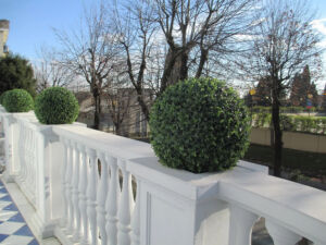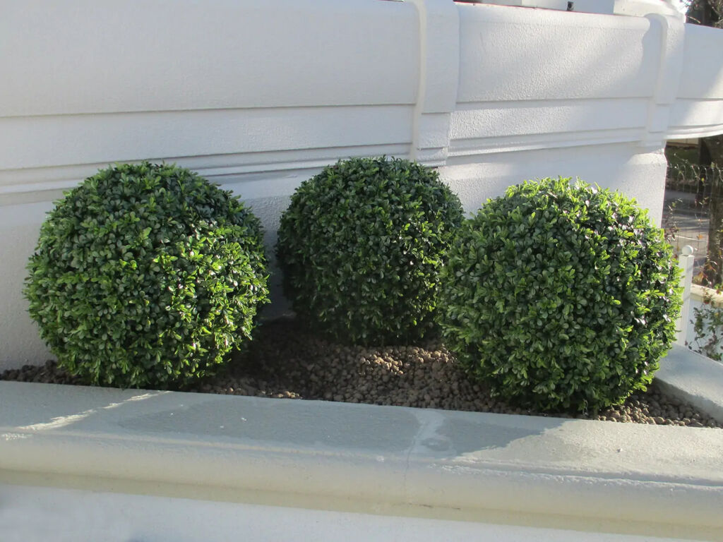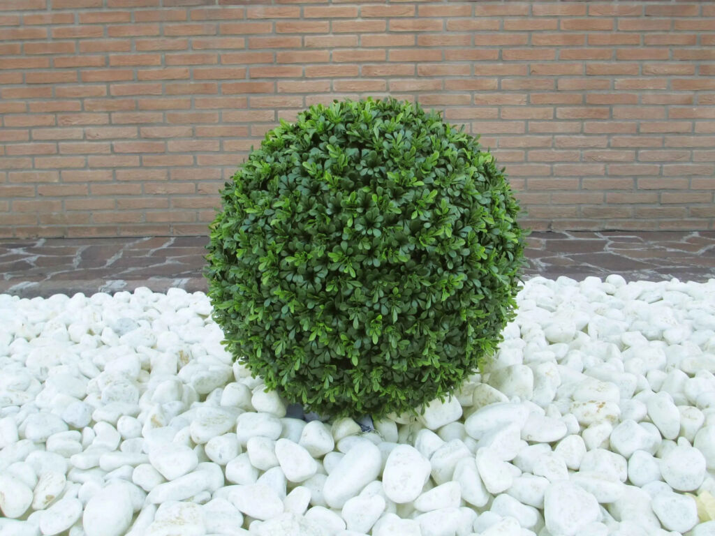 Buxusová koule  od italského výrobce z velmi kvalitního a odolného materiálu. Umělý buxus je UV odolný (barvostálý), odolný vodě i mrazu. Přesto je vhodné jej přes zimu schovat nebo alespoň přikrýt.