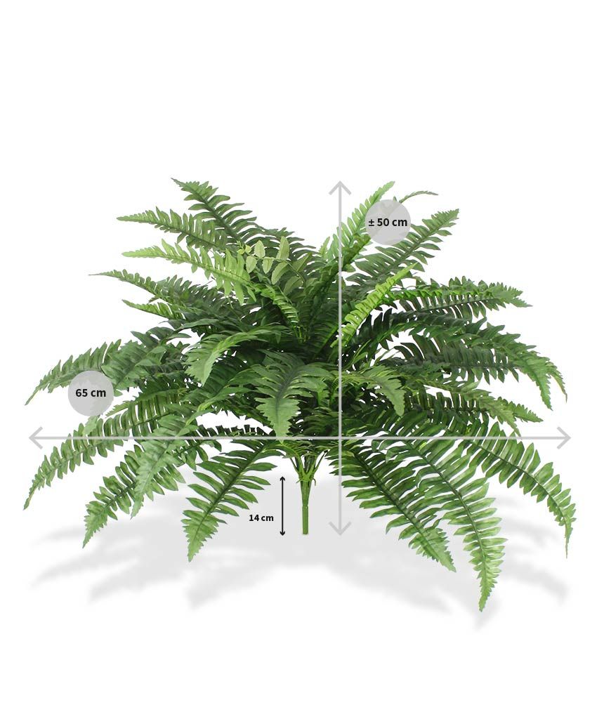 husté kapradí široké 65cm, vysoké 55cm je složeno ze 49 listů. Dodáváno bez květináče. Ve spodní části kapradiny je zapichovací trn (cca 14cm).