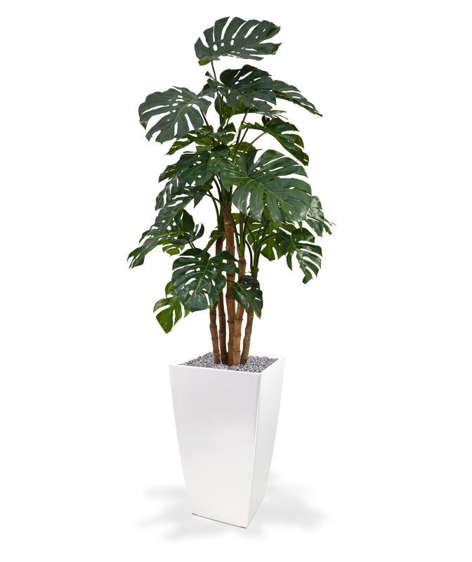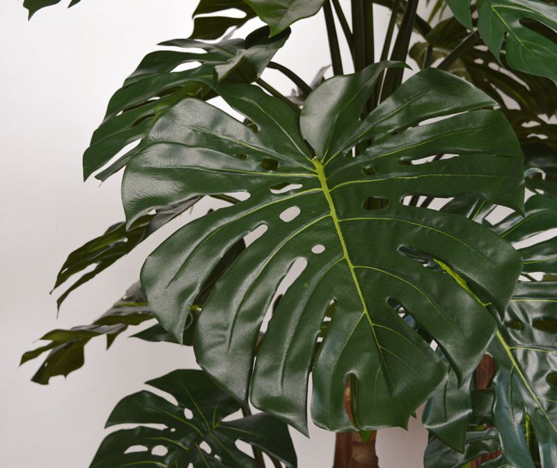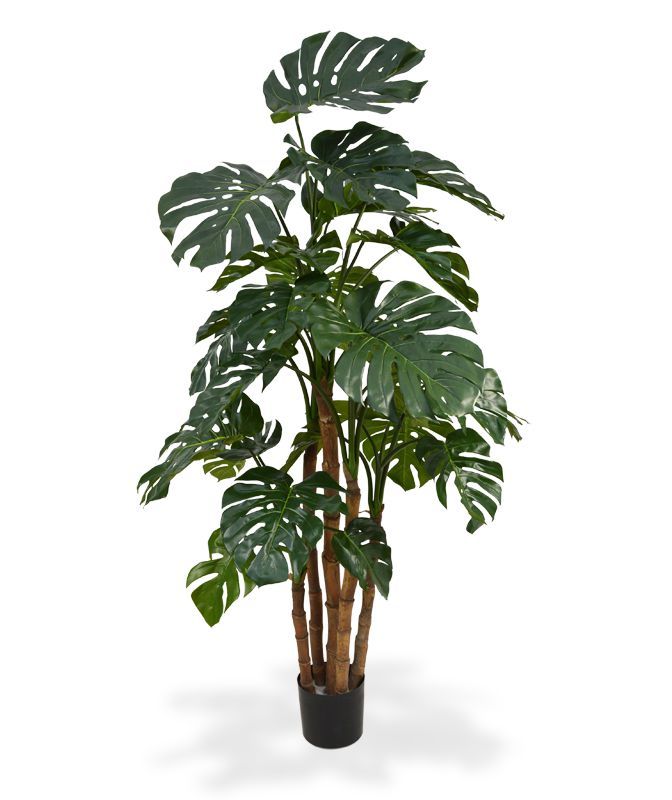 Umělá Monstera vysoká cca 180cm. Složeno z 5 kmenů a 31 listů.. Ukotveno v plastovém květináči 20x18cm. Průměr je cca 105cm.