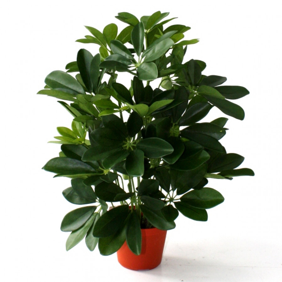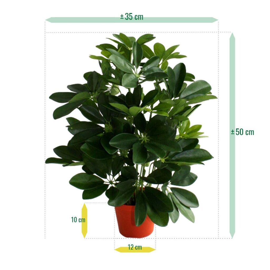 Hezká drobnější dekorace schefflery je dodávána v zobrazeném plastovém květináči 12x10cm. Celková výška rostliny je cca 50cm, průměr 35cm.