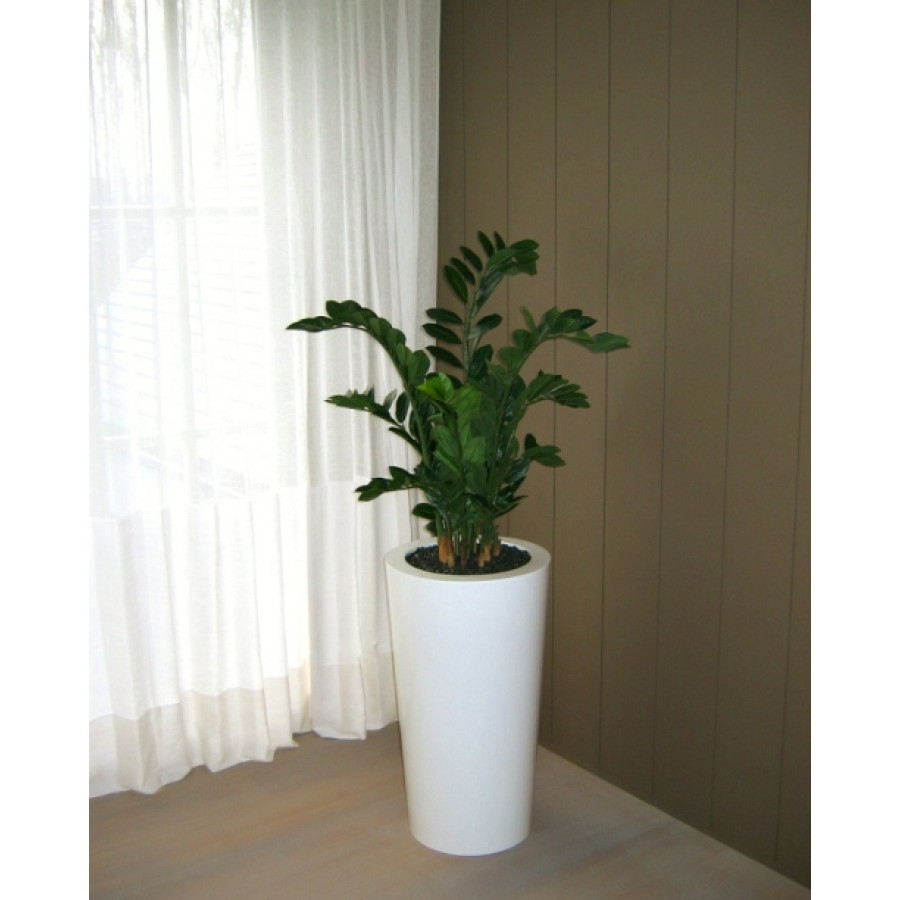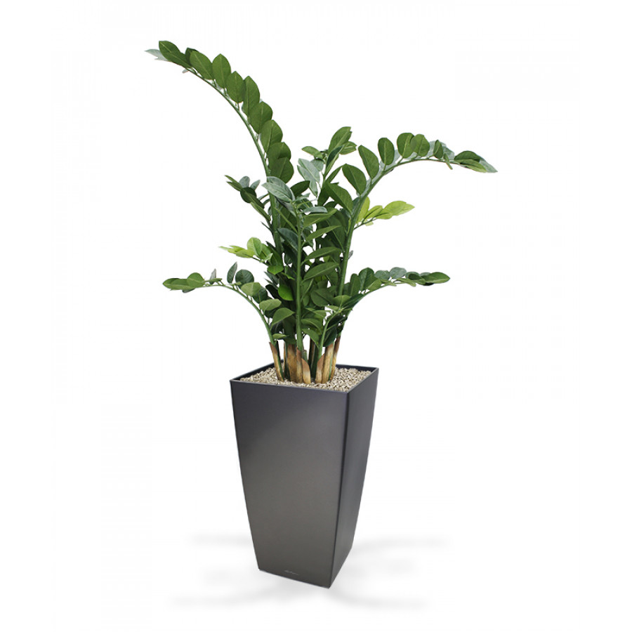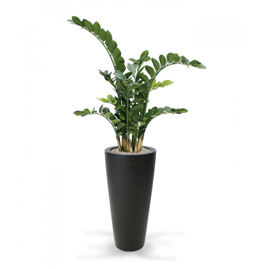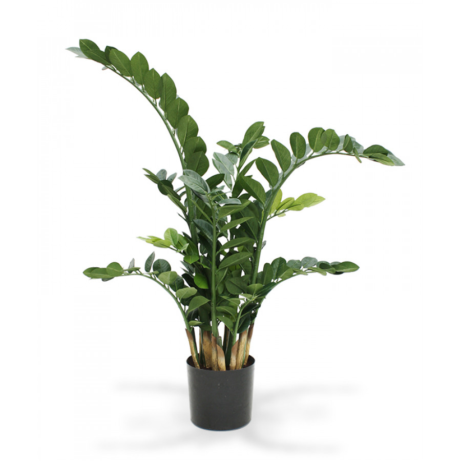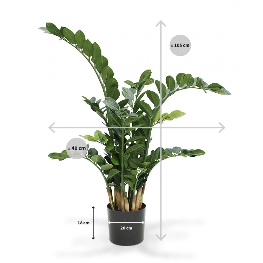 umělý zamioculcas vysoký 100 – 105 cm. Šířka koruny 60cm. Uko4veno v černém plastovém květináči (20x18cm). Celkový počet listů je 237.