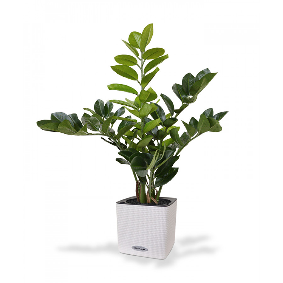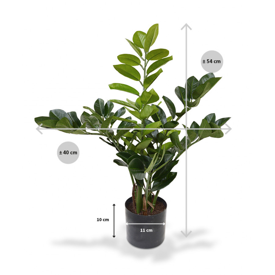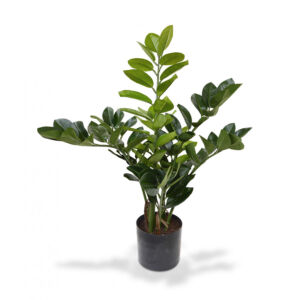 umělý zamioculcas vysoký 55cm. Šířka koruny 40cm. Ukotveno v černém plastovém květináči (10x11cm). Celkový počet listů je 94.