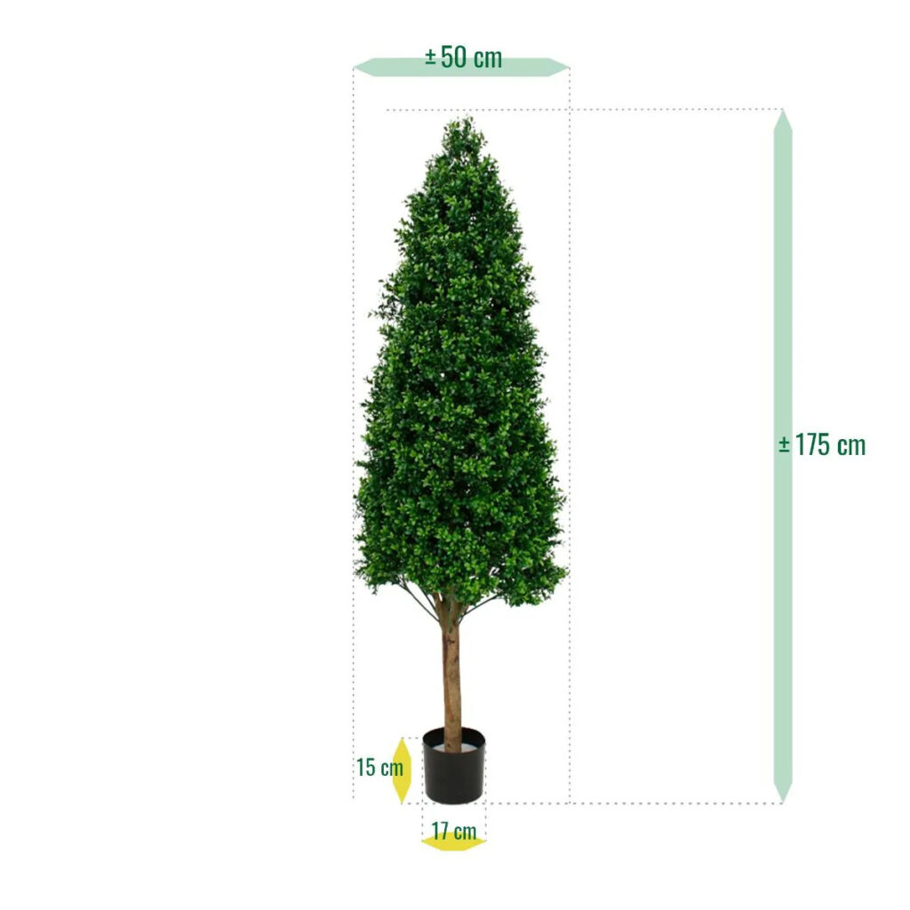 umělý buxus ve tvaru kuželu s přírodním kmenem. Vhodný do exteriéru. Ukotveno v plastovém květináči.