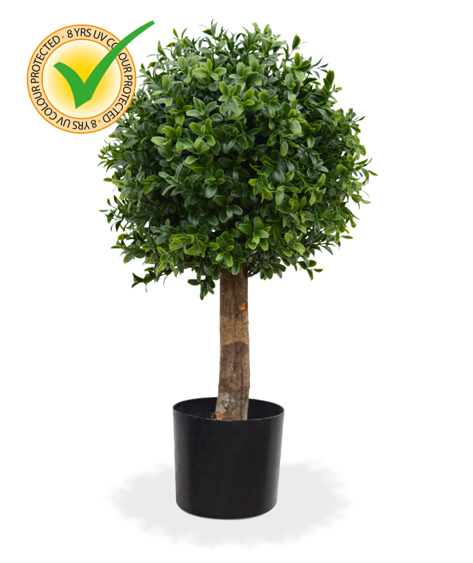 Umělý kulovitý buxus na přírodním kmínku. Výška 45cm, průměr koule 25cm. Vhodný do exteriéru díky materiálu s UV ochranou.