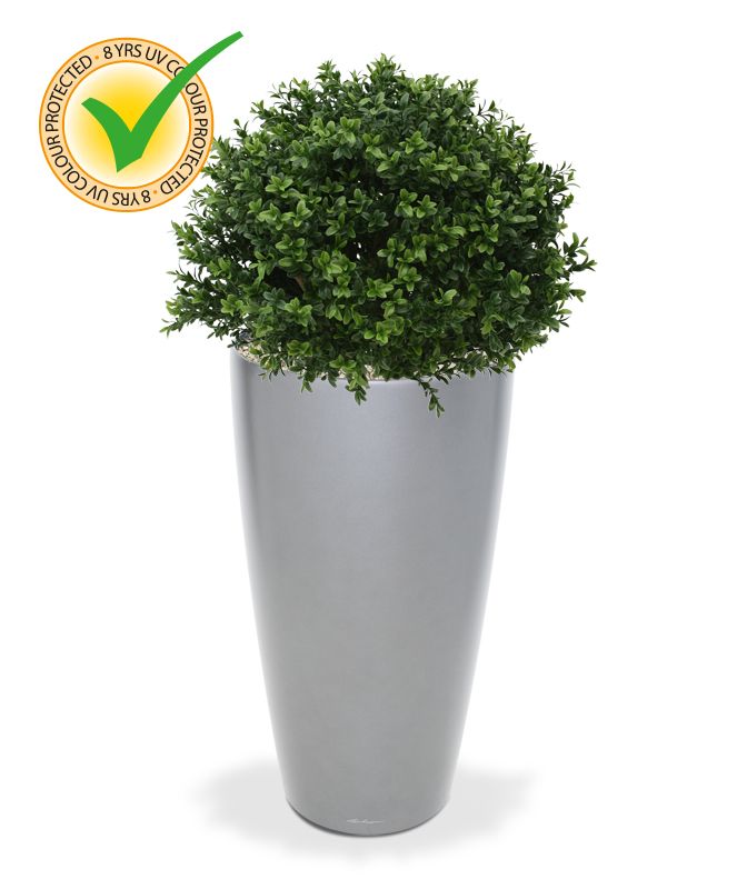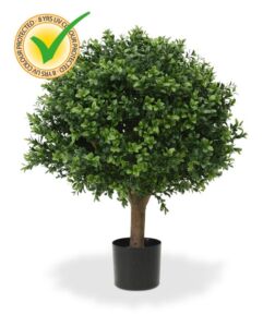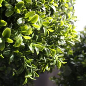 Umělý kulovitý buxus na přírodním kmínku. Výška 55cm, průměr koule 40cm. Vhodný do exteriéru díky materiálu s UV ochranou.