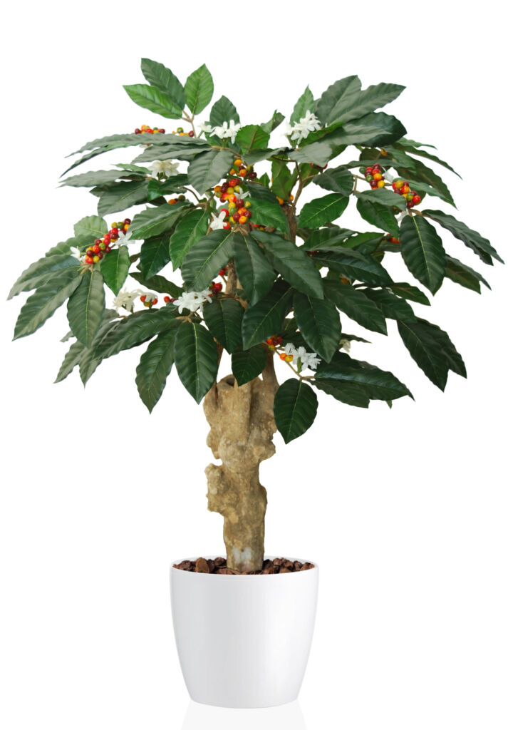 špičková imitace kávovníku s výrazným kmenem od italské společnosti ILA. Kmen vyroben z přírodního exotického dřeva. Standardně dodáváno ukotvené v plastovém květináči.